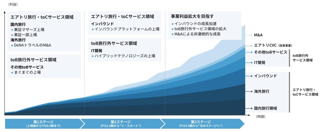 旅行事業において成長投資を継続し安定収益の底上げ、断続的なM&Aの実行とtoB収益の積み上げにより全体利益の伸張を企図