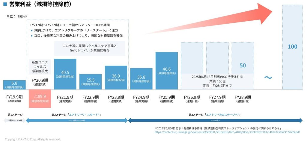 エアトリグループは、グループ連結取扱高5,000億円の達成に向けて「終わりなき成長」を目指し、⼤型案件を含む断続的なM&Aの実⾏による成長牽引を目指します。また、業績目標として、FY28.9期までの営業利益(減損等控除前)50億円、その後の100億円への拡大を掲げています。