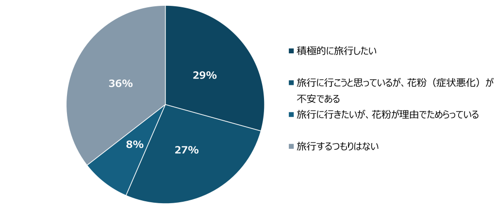 花粉シーズン(2月~5月)の旅行に対し、3人に1人以上が「旅行に行こうと思っているが、花粉(症状悪化)が不安である」「旅行に行きたいが、花粉が理由でためらっている」と回答。