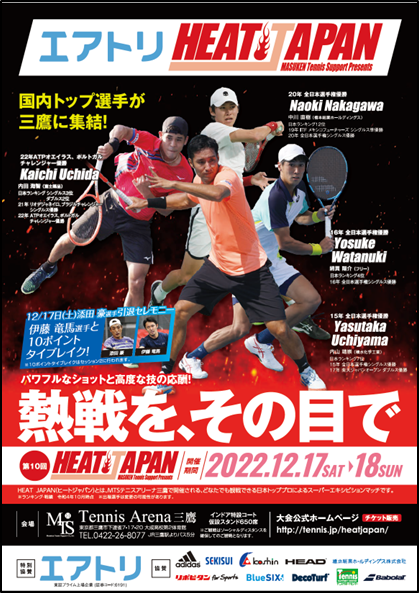 One Asiaのビジョンをかかげ、ITの力で、エアトリ旅行事業、ITオフショア開発事業、訪日旅行事業・Wi-Fiレンタル事業、メディア事業、投資事業(エアトリ CVC)と地方創生事業を手掛ける株式会社エアトリ(本社:東京都港区、代表取締役社長 兼 CFO:柴田 裕亮、証券コード:6191、以下当社)は、2022年12月17日(土)〜12月18日(日)にMTSテニスアリーナ三鷹にて開催される、日本テニス界のトッププロが集結するスーパーエキシビジョンマッチ「エアトリ HEAT JAPAN2022」に冠協賛し、会場の看板及びのぼりへロゴを掲出いたします。